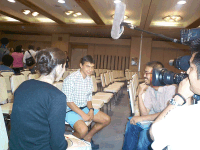 Studying volcanism... From Wednesday August 2nd on, we met together, French and Japanese, and we talked. The Japanese team leaders took the whole morning to propose us 7 different types of games. We had lunch around 12 a.m., then in the afternoon, we resumed our activities in the groups, we had to figure out the map of the world some 250 million years ago. During the exercise, we learned about the system of plate tectonics. On Friday August 4th, we made an experiment about subduction, we had to do it over, and we made schematic drawings to explain the experiment. We had lunch, and we did the experiment again, for the camera. Later, a team from the NHK national television network came to report on the science camp... Two weeks later, on Friday August 18th, we made a public exhibition of our work. It had to be perfect, and we worked quite hard for it. We checked the good operation of all the experiments that were to be presented, we put everything in place, and each group prepared its oral presentation. The exhibition was open from 2 p.m. to 3:30 p.m., in the presence of the mayor of Kosaka and some other important persons, French and Japanese nationals, who had contributed to make this great adventure possible. In the evening, after our visit to the traditional Japanese Kabuki theatre, we had a grill party, offered by the mayor of Kosaka. It was a very fine party. We also had a demonstration of Japanese traditional drums, with one of our Japanese team leaders and her group. We tried it too, but it is necessary to have a good feeling of rhythm... That was our last party in that city that had welcomed us so well.